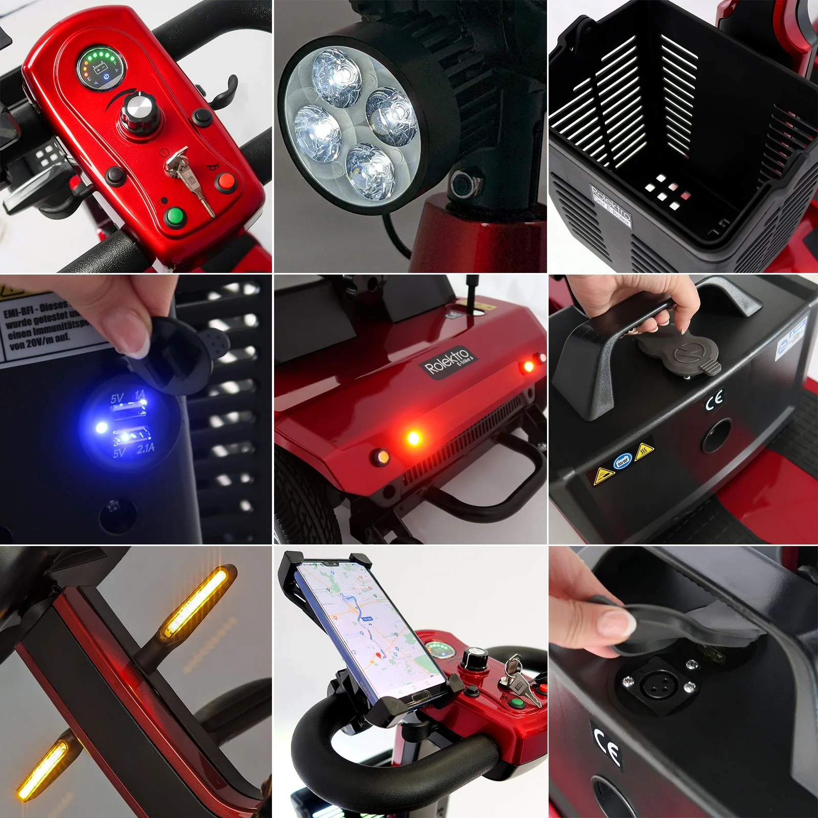 De extra uitrusting, zoals twee USB-aansluitingen, mobiele telefoonhouder, LED-lampje, mandje aan de voorkant en indicatoren, is al bij de prijs inbegrepenDe Trike 6 helpt u nieuwe mobiliteit te verwerven, niet alleen op trottoirs of in voetgangersgebieden, maar ook in uw huis en appartement. Dankzij een breedte van slechts 50 cm is het doorrijden van deuren geen probleem. Met een lengte van 110 cm past dit elektrische voertuig in 95% van alle liften. Om ook in appartementen de wendbaarheid te behouden, heeft de Trike 6 een zeer kleine draaicirkel en een extra achteruitversnelling.