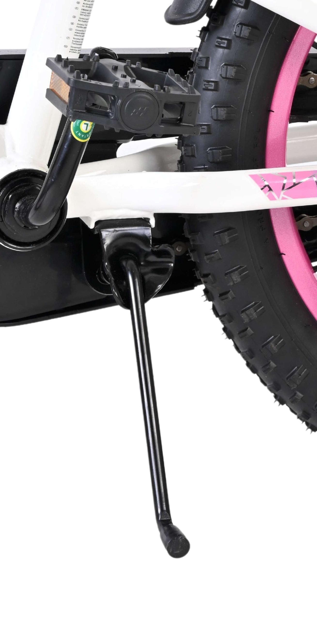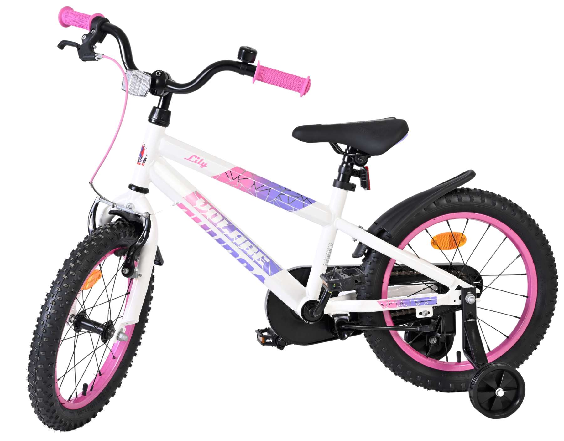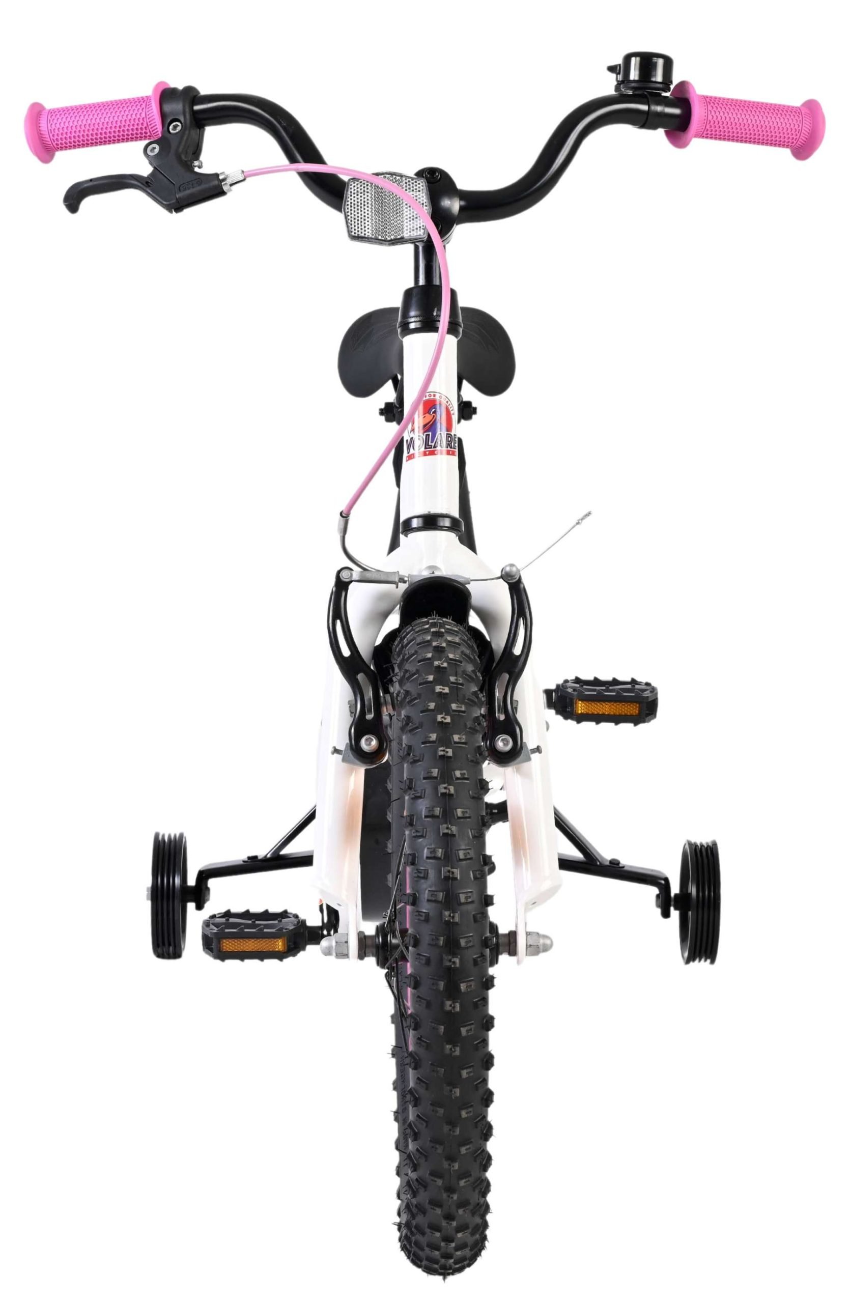 De Volare Lily 16 inch kinderfiets is een prachtige fiets voor jonge meiden die graag in stijl fietsen. Met haar frisse witte kleur, paarse en roze accenten en opvallende roze velgen en handvaten is deze fiets een echte eyecatcher.